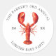 Autocollants personnalisés à thème de homard rouge pour votre prochaine soirée de biscuits de homard ou de fruits de mer. Il présente une illustration de style aquarelle d'un homard rouge. En dessous et au-dessus, il y a des spots pour les informations sur le menu de votre événement.