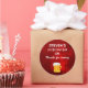 Merci autocollant pour une fête d'anniversaire. L'arrière - plan est un arrière - plan de texture peinte de style grunge rouge profond avec des coups de pinceau épais, des raclettes et des rayures. Un bonbon de couleur rouge vif superposé sur une couleur rouge rubis foncé. Une illustration d'une tasse de bière mousseuse est placée sous le texte.
