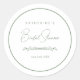 Add a charming finishing touch to your bridal shower favors with this Sage Green Toile Round Sticker. Featuring a delicate toile pattern in soft sage hues, these stickers are perfect for sealing envelopes, decorating gift bags, or accenting favors. Elegant, versatile, and designed to coordinate seamlessly with your invitations and other shower stationery.