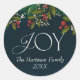 Diffusez la joie festive avec cet autocollant élégant en forme de cercle "Saison de joie". Avec de belles branches de pin, des baies rouges et des accents blancs sur un fond bleu foncé, il est parfait pour personnaliser les cadeaux de Noël, les cartes, les enveloppes ou les faveurs de fête. Personnalisez avec le nom de votre famille pour un effet spécial cette saison des fêtes.