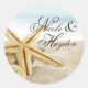 Ces magnifiques stickers de plage disposent d'une étoile de mer et de coquillages sur une jolie plage de sable - parfait pour les mariages à thème de la plage et des événements de fête. Cliquez sur le bouton CUSTOMISER IT pour ajouter votre texte. Des invitations de mariage, des autocollants, des cartes RSVP, des sacs de faveur et bien plus sont disponibles. Pour toute demande d'une autre couleur ou d'autres éléments présentant ce design, contactez-moi : cheryl@cheryldanielsart.com. "Starfish Couple" de Cheryl Daniels © 2014.