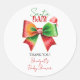 Red and green bow, Santa hat and snowflakes Christmas Santa Baby shower round sticker. This festive round sticker for your Christmas Santa Baby shower is a real treat! It features a lovely red and green bow, artfully sprinkled with snow and adorned with a central snowflake, ans also a cheerful Santa hat. The words "Santa Baby" are beautifully presented in flowing, decorative lettering.