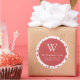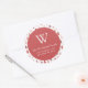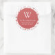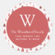 Cet autocollant d'adresse de retour moderne présente un cercle rose poussiéreux sur un motif lunatique d'inspiration scandinave de pins à feuillage persistant roses, roses et bordeaux sur un arrière - plan blanc. Personnalisez le design avec votre nom de famille et votre initiale monogramme en police serif blanche, avec votre adresse ci-dessous dans sans serif.