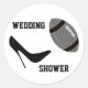 Baguettes de sceau sur le thème du football amusant. Fait en rond, avec un arrière - plan blanc et des graphismes d'un football gris, jaune et noir, on frappe avec une élégante chaussure de talon noir stiletto noir. Le texte en noir est Wedding shower. Personnalisez le texte de votre événement.