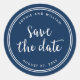 Autocollant élégant et rond "Save the Date" sur le thème nautique avec une bordure à rayures blanches et les mots "save the date" en écriture cursive tendance sur fond bleu. Utilisez-le pour sceller vos enveloppes. Découvrez d'autres articles de mariage ici https://www.zazzle.com/rosewoodandcitrus/gifts?cg=196540141241316965&rf=238364477188679314