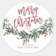 Un autocollant cadeau de Noël festif, rouge, vert et blanc, un autocollant de faveur ou une enveloppe avec un script audacieux et une verdure aquarelle avec feuilles et baies.