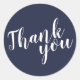 Script moderne Marine Blue Wedding Favor Sticker Merci avec titre en blanc police de caractères modernes sur fond bleu marine.