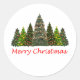 Seven decorated Christmas Trees in a row with Merry Christmas written underneath them.