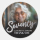 Seventy script text in silver effect color and one large photo 70th birthday favor thank you stickers. Use for a fun addition to your birthday party favors to thank your guests for coming! Personalize this 70th birthday design with your own photo, name, thanks or other wording. Other years and matching items are available and can be created by request. © Original design by Sarah Trett for www.mylittleeden.com on Zazzle.