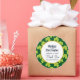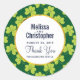 sticker mariage Merci avec un motif extensible mignon avec des trèfles vert olive sur un arrière - plan vert foncé. Un cercle superposé avec une fausse bordure en feuille d'or avec votre texte personnalisé à l'intérieur.