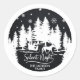 sticker rond de Noël avec silhouettes de pins blancs avec des flocons de neige et un traîneau tiré par le cheval sur un arrière - plan noir, avec le libellé Silent nuit en lettres manuscrites. Facile à personnaliser en ajoutant votre nom de famille ou votre texte