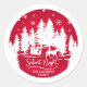 autocollant rond de Noël avec silhouettes de pins blancs avec des flocons de neige et un traîneau tiré par le cheval sur un arrière - plan rouge festif, avec le libellé Silent nuit en lettres manuscrites. Facile à personnaliser en ajoutant votre nom de famille ou votre texte