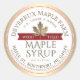 Ajoutez votre nom d'entreprise, votre adresse, vos coordonnées, le volume de sirop et de sirop d'érable. Étiquette blanc avec une feuille d'érable à sucre or et une bannière rouge sous le texte modifiable "feu de bois" (ou PURE LOCAL) Bordure de dégradé d'or.