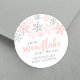 A Little Snowflake Is On The Way Baby Shower Round Sticker. Add a festive touch to your baby shower with this sweet and elegant round sticker, perfect for celebrating the upcoming arrival of a winter baby girl. The design features soft watercolor snowflakes at the top in delicate shades of pink and gray, with “A Little Snowflake Is On The Way” and the mother-to-be’s name displayed below in a mix of handwritten script and classic serif fonts for a cozy, wintery feel.