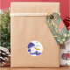 Un grand tag pour vos cadeaux. Un mignon bonhomme de neige avec un gros nez de carotte et un petit coeur rose sur la joue. Casquette bleu, écharpe et oreilles bouffées. Petits flocons de neige dans l'arrière - plan. Customisez comme vous le souhaitez.