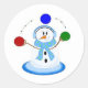 Un mignon bonhomme de neige en vacances en train de lancer des boules dans l'air.
