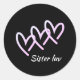 Un arrière - plan noir à triple coeur soeur luv avec texte rose. Ajoutez ces autocollants pour les anniversaires, baby showers, mariages ou cadeaux de vacances. Modifier le texte pour modifier le nom ou la couleur de l'arrière - plan. Cet autocollant est pour la soeur luv que vous partagez.