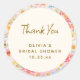 This bridal shower sticker features a lush watercolor floral border in soft pastel pink, peach, lavender, and blush blooms surrounding a cream center with "Thank You" in an elegant handwritten script. The bride's name, event, and date make it a personal, coordinated finishing touch for favors, gift bags, or envelope seals. A sweet match for a garden party, spring, or summer bridal shower with a romantic, cottagecore feel. Personalize with the bride's name and shower date.