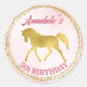 Pink et or cheval fête d'anniversaire personnalisées autocollants avec cheval doré, cercle or, arrière - plan rose.