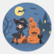 Sticker Rond Sorcière d'Halloween, Chat noir et Citrouilles sur