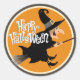 Une vilaine sorcière dans un balai avec le texte "Happy Halloween". Beaucoup d'utilisations pour cet autocollant pendant l'automne et la saison d'Halloween. Idéal pour les fêtes, la correspondance, et juste pour le plaisir.