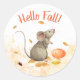 Une souris à l'aquarelle entourée de feuilles d'automne et d'une citrouille.