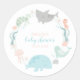 Cet autocollant de baby shower sur le thème de la mer comprend une baleine, un requin tigre, de la gelée, une tortue de mer et un hippocampe qui nagent en cercle avec de l'herbe de mer et des coquillages.