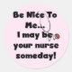 T-shirts, tasses, cartes, autocollants, boutons, sacs, et autres vêtements et cadeaux de soins infirmiers avec un stéthoscope et un texte qui dit "Sois gentil avec moi...Je pourrais être votre infirmière un jour!"