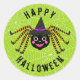 Cet autocollant présente une mignonne araignée assise sur sa toile en costume de sorcière, avec des bas rayés, des chaussures de sorcière et un casquette. Sticker texte est "Happy Halloween !" Art par Anne Coffey.