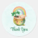 stickers Merci, avec une adorable illustration montrant un pot vert et or souriant avec un arc-en-ciel mignon, un nuage heureux et un trèfle vert.