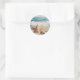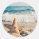 Stickers avec une photo pittoresque. Une grande étoile de mer dressée sur une plage de sable. Une belle mer bleue avec des vagues de surf blanc en arrière - plan.