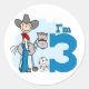 Troisième anniversaire pays mignon western / rodéo thème bâton cowboy en jeans et bandana rouge avec cheval et chien, grand bleu numéro 3.