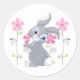 Cet autocollant rond est montré en blanc avec un joli lapin et des fleurs roses imprimé. Customisez cet objet ou achetez tel quel.