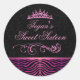 Ce sceau d'enveloppe d'anniversaire Elégant personnalisable en Sweet sixteen comporte des tourbillons roses et des imprimés zèbres sur un arrière - plan damassé noir. Customisez-le en ajoutant vos détails dans la couleur et la police de votre choix !