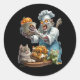 Sticker. A creepy chef is cooking food with his furry friends sitting next to him.