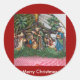 Autocollant de Noël rond, arrière - plan rouge, avec la photo de la Nativité et les mots : Joyeux Noël