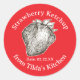 A bright sticker red decorated with a strawberry hand illustrated with black ink with text curved around the edges that can be edited with your personal or business information and date condiment was made.