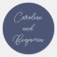 Élégant Mariage de script moderne Noms Marine Bleu Classic Sticker rond