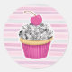 Un mignon cupcake rose avec un glaçage brillant et une cerise sur le dessus décorent cet autocollant. Cupcake est sur une aquarelle rose rayé violet et bleu arrière - plan. Un autocollant amusant pour envelopper les cadeaux ou pour la fête d'anniversaire d'une fille. Conçu pour vous par Blackberry Boulevard.