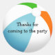 Illustration d'une balle de plage en bleu, blanc, orange et vert. Le texte dit "Merci d'être venu au parti" mais vous pouvez le personnaliser avec votre propre texte. Ces autocollants sont parfaits pour une fête d'été ou de piscine. Utilisez-les comme autocollants de faveur ou pour sceller les enveloppes. © Oeuvre d'Art de Delighful-Doodles Tous droits réservés.