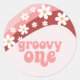 SUPER ! Autocollants de fête de premier anniversaire d'inspiration rétro avec marguerites de style 70's et polices et couleurs boho.