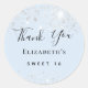 Un autocollant pour une fête de 16 ans Sweet 16, 16e anniversaire, girly et glamour. Un arrière - plan bleu clair, bleu bébé avec de la poussière de parties scintillant fausse argent. Le texte : Merci est écrit avec un grand script de style à la main moderne. Personnalisez et ajoutez un nom.