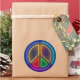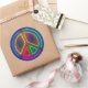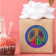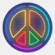 Graphic of a multicolored neon peace sign symbole against a brick wall background