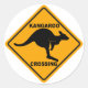 Panneau traditionnel de passage à niveau kangourou vu dans l'arrière-pays australien. Signal d'avertissement en forme de losange jaune et noir.