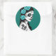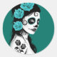 This Day of the Dead inspecred design fea beautiful woman with sugar skull patterns on her face. Three roses appear dans le jet black hair with two more roses tattooed on her pauvre. The girl is standing sideways with her head turned slightly towards the viewer. La pure white skin really out against the black hair and dress as well as the teal blue background. This unique design is a stunning representation of this Day of the Dead woman.
