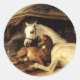 Refonte élégante et classique de la peinture du peintre anglais Sir Edwin Henry LANDSEER, 18 ans. Century.Beau cheval oriental blanc arabe et son colt avec des chiens, des singes dans une tente arabe dans des couleurs brun, blanc, rouge éclatantes.