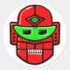 Une tête de robot en rouge avec un élégant panneau en forme de croissant vert, un troisième oeil vert, avec des dents blanches et des reflets. Il a une sorte de grain bizarre comme s'il a découvert les merveilles d'une nouvelle huile à moteur révolutionnaire. D'un dessin vectoriel original de N.A. Berry.