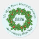 Sceau d'enveloppe de Noël en texte courbe. Autocollant rond et blanc avec trois zones de texte personnalisées en police imprimée vert foncé. Une couronne de houx et de baies au centre avec un lieu pour la date de l'année.