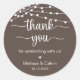 Modern Wedding minimalist "Thank You for celebrating with us" cookies and gifts round sticker, in romantic script, little heart, with bride and groom signature and wedding date,dark taupe brown theme wedding favors label.