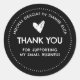 Express your gratitude with this charming thank-you sticker, featuring the phrase 'Thank you for supporting my small business' in a casual, friendly Chelsea Market font. Set on black background, the text is accented by a delicate heart illustration and a subtle ring of dotted details, giving it a warm and welcoming feel. Perfect for adding a personal touch to packages, this sticker is a beautiful way to show appreciation for your customers' support.